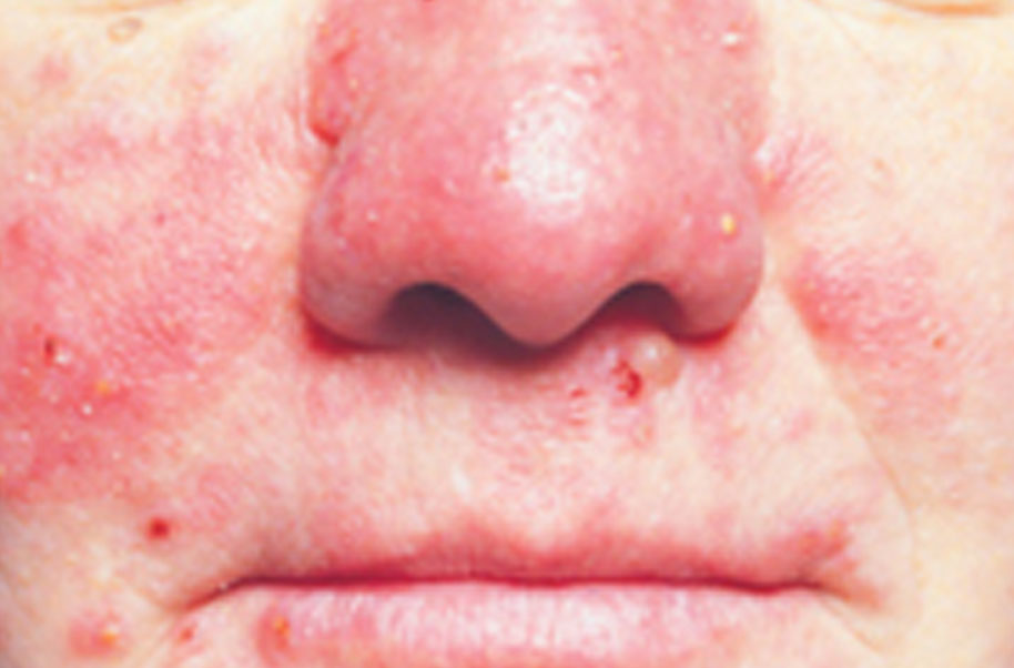 Key symptoms are facial redness with swollen red bumps and small visible blood vessels.