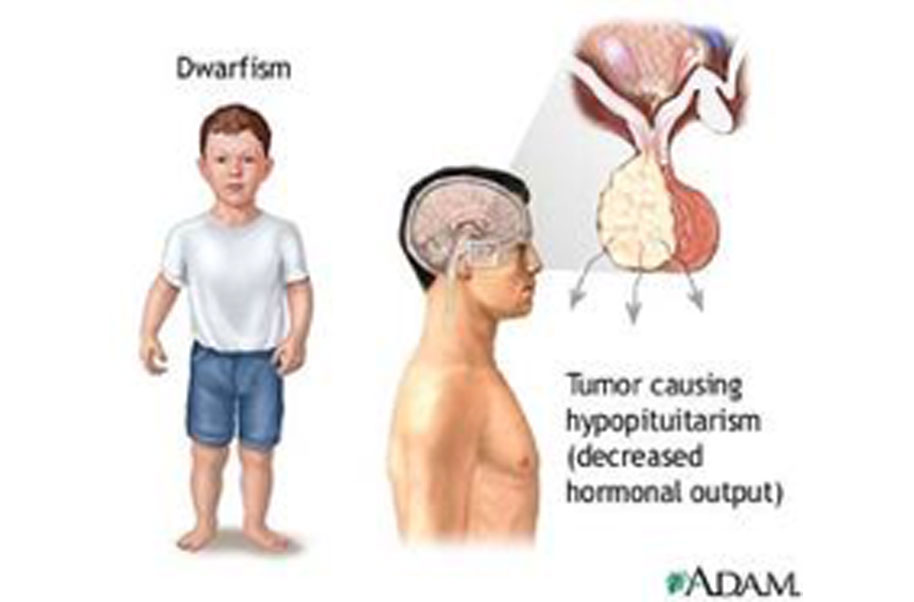 A genetic disorder of bone growth, achondroplasia is the most common cause of short stature with disproportionately short limbs -- dwarfism with short arms and legs. There is a typically large head with prominence of the forehead (frontal bossing), underdevelopment (hypoplasia) of the midface with cheekbones that lack prominence, and a low nasal bridge with narrow nasal passages. The fingers are short and the ring and middle fingers diverge giving the hand a trident (three-pronged) appearance.