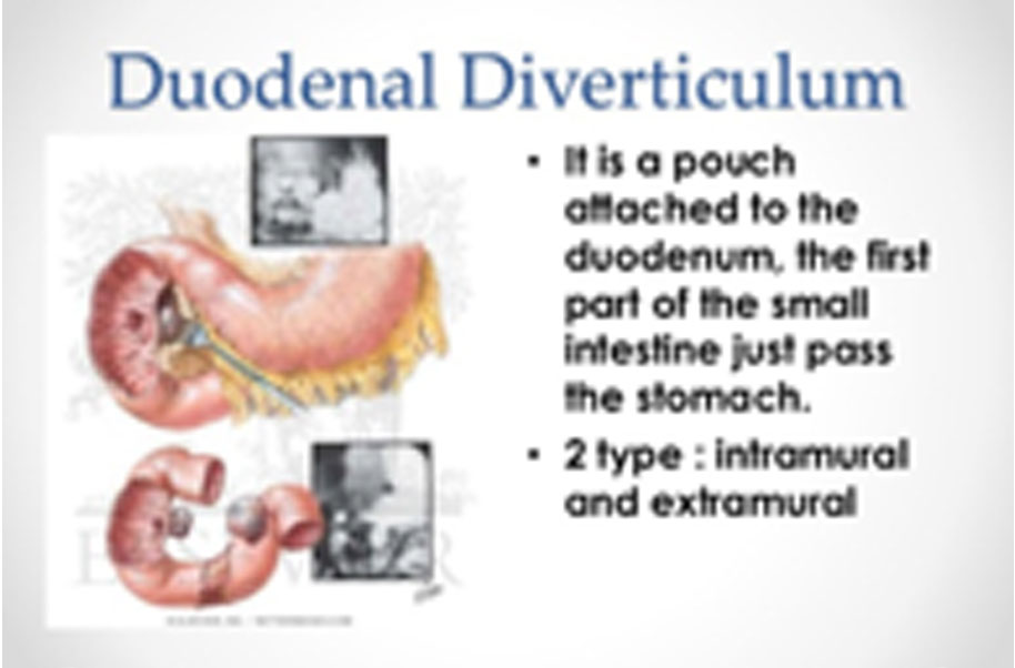 Extramural diverticula may vary in size from a few millimeters to a few centimeters. They usually are located in the area around the papilla of vater where the bile and pancreatic ducts enter the duodenum. A second, rare type of diverticulum is referred to as an "intramural" diverticulum.