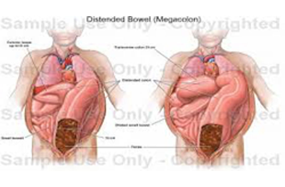 Megacolon is an abnormal dilation of the colon (also called the large intestine). The dilation is often accompanied by a paralysis of the peristaltic movements of the bowel.