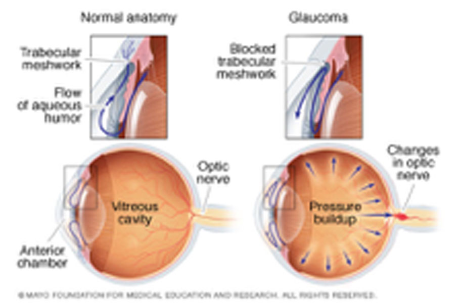 In open-angle glaucoma, the angle in your eye where the iris meets the cornea is as wide and open as it should be, but the eye's drainage canals become clogged over time, causing an increase in internal eye pressure and subsequent damage to the optic nerve.