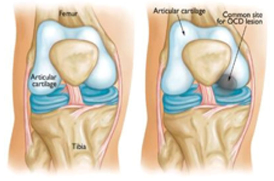Osteochondritis dissecans: a condition in which a fragment of bone in a joint is deprived of blood and separates from the rest of the bone, causing soreness and making the joint give way.