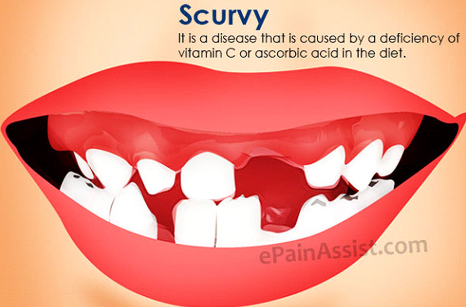Scurvy can lead to skin spots, loss of teeth, fever, bleeding gums, lethargy and might also lead to death. This is caused by deficiency of vitamin c.