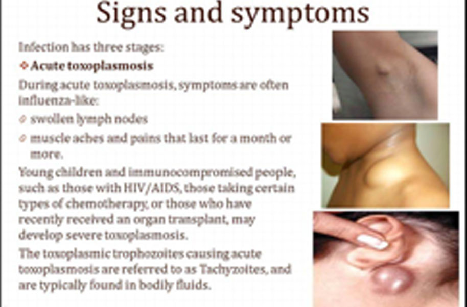 Most healthy people who are infected with toxoplasmosis have no signs or symptoms and aren't aware that they're infected. Some people, however, develop signs and symptoms similar to those of the flu, including:
