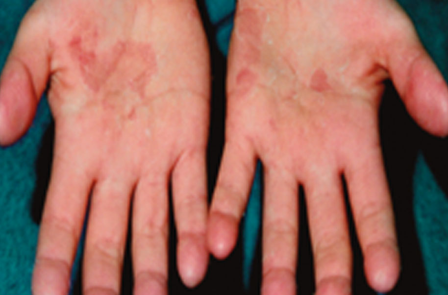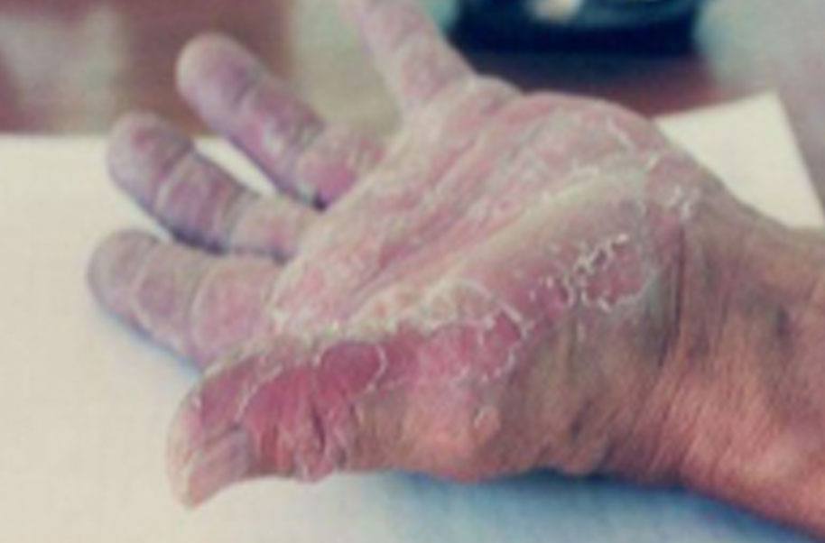 Keratolytic winter erythema also often termed as oudtshoorn disease, oudtshoorn skin, and erythrokeratolysis hiemalis is a rare form of autosomal dominant skin disease. It is identified as a cyclical disruption of epidermal keratinisation, which predominantly affects the palmoplantar skin, causing patches of thickened skin, redness and peeling of the skin on the soles and palms.
