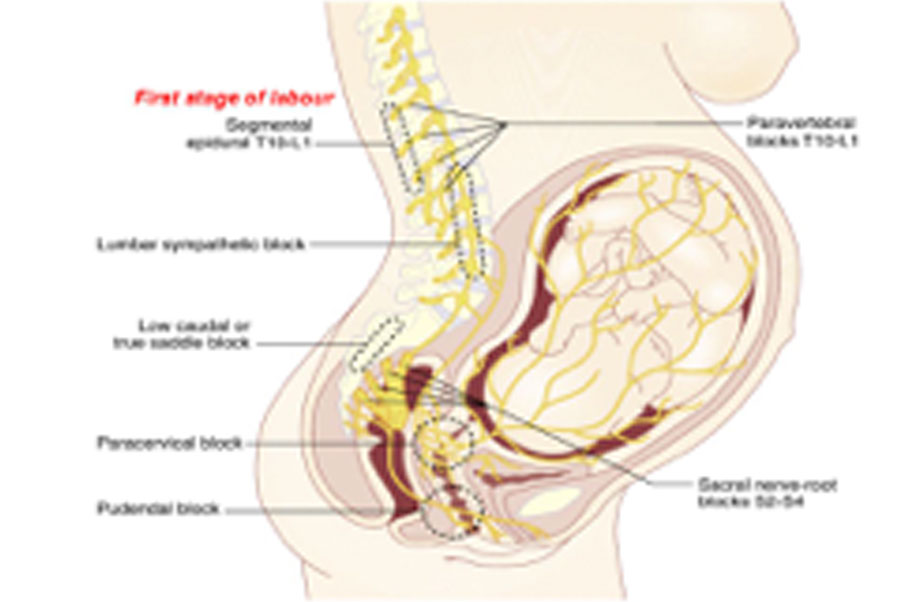 Three types of local anesthesia may be used for childbirth: the paracervical block, the pudendal block, and local infiltration of the perineum. The paracervical block is given during the late first stage. Two injections of local anesthetic drugs are made into the cervix and bring pain relief during contractions.